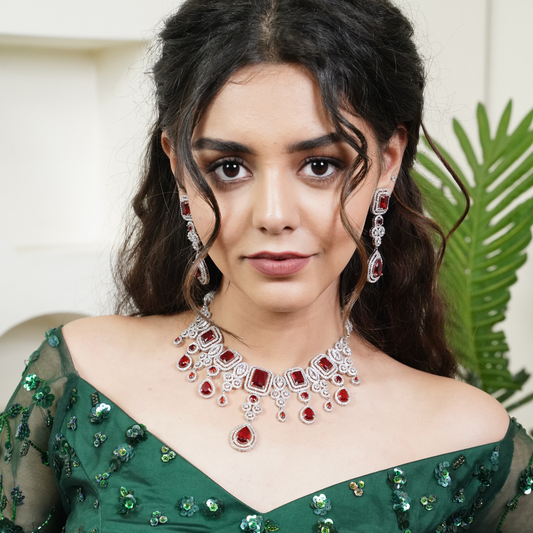Tahira Ruby Red American Diamond Necklace Set with Maang Tikka