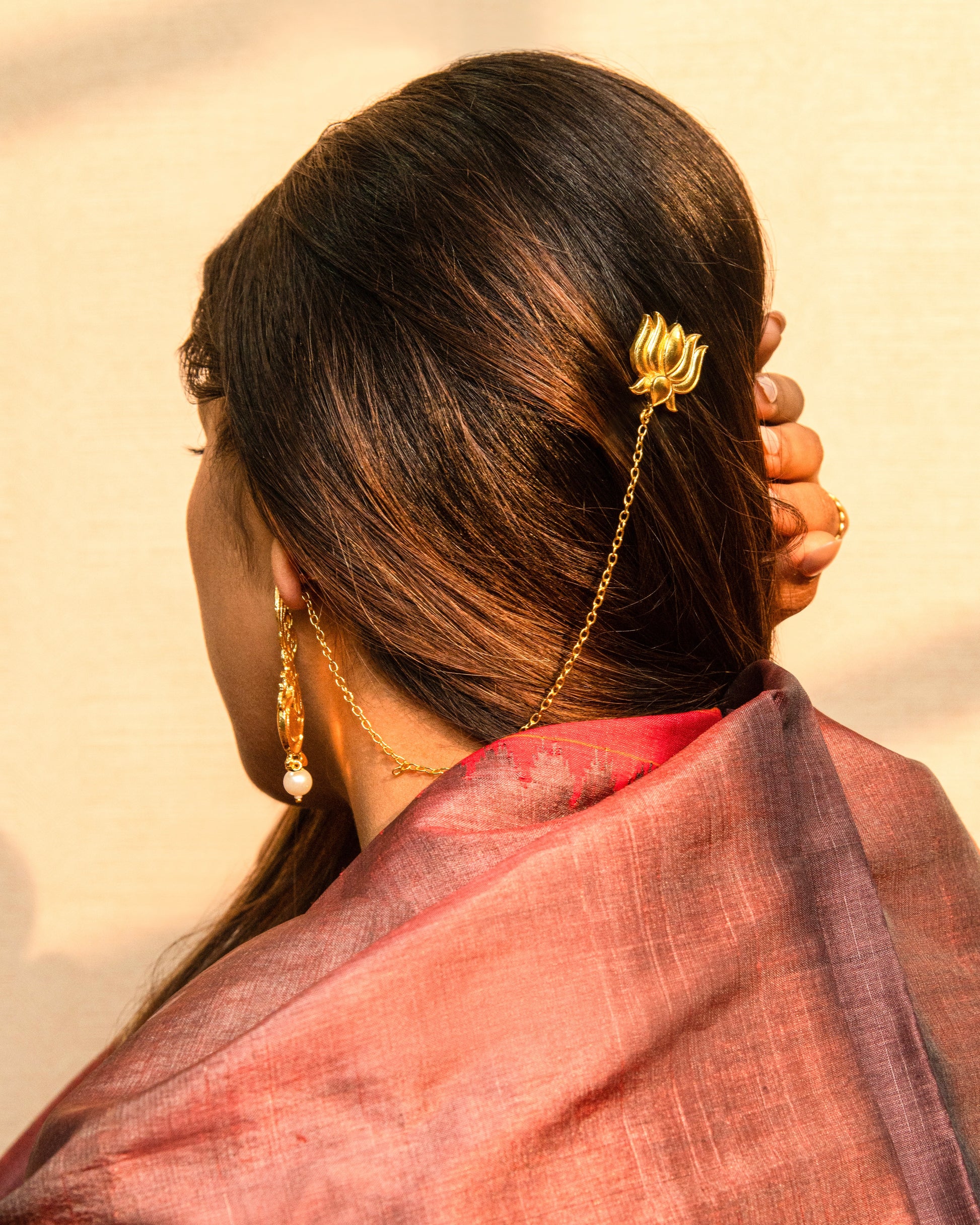 The Kamal Chaand Chain is a graceful hair accessory that celebrates timeless tradition with modern charm. Handcrafted in pure brass and delicately gold plated, it draws inspiration from the celestial beauty of the moon and the purity of the lotus. A unique blend of heritage elegance and contemporary styling, perfect for adorning festive or bridal looks.