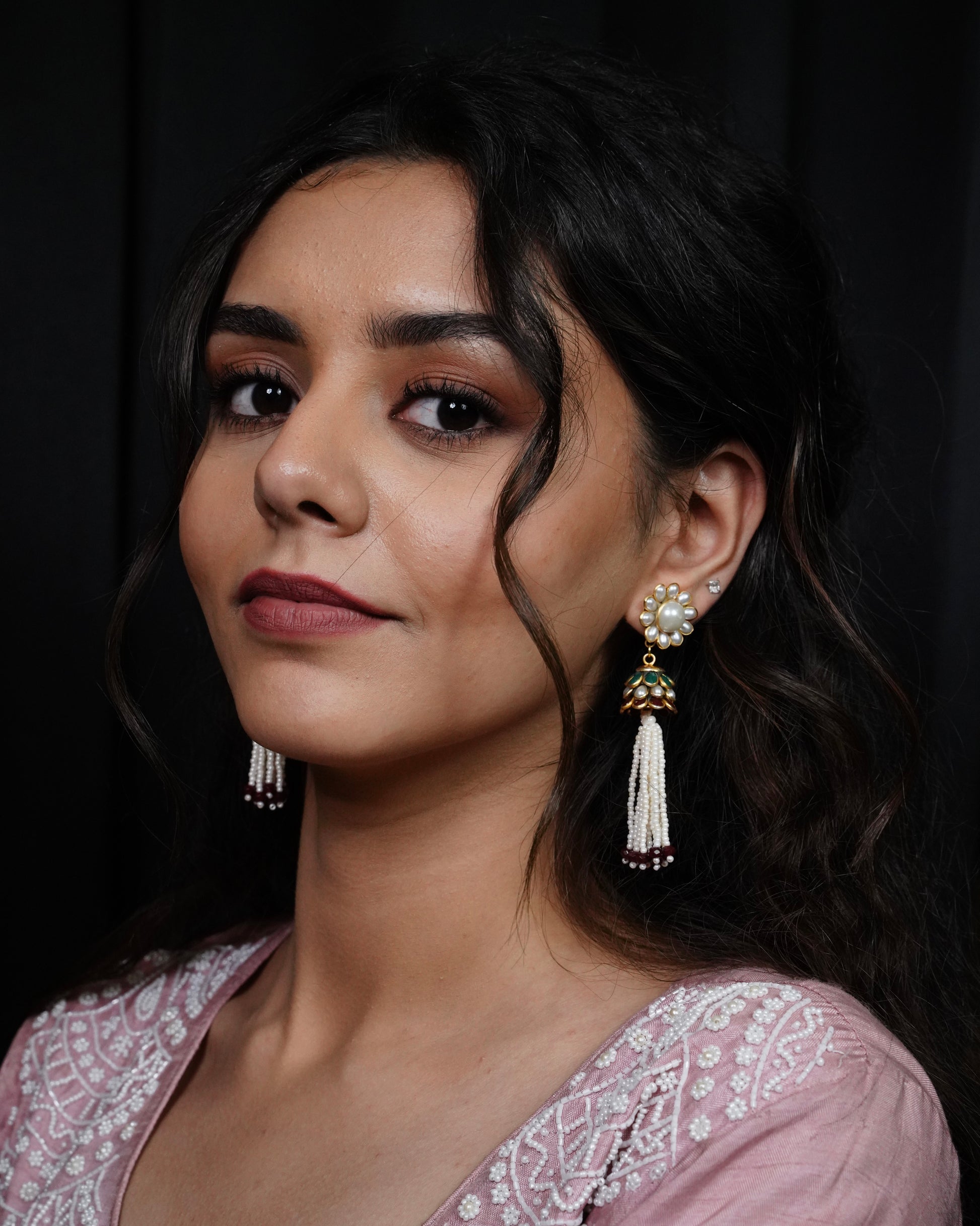 The Malasa Red Onyx Pearl Drop Earrings are a graceful fusion of emotion and elegance. Featuring a dainty floral top that cascades into a cluster of soft white ched pearls and vivid red onyx drops, these earrings radiate warmth and charm. Finished in 18kt gold polish with intricate jadau setting, they embody traditional Indian luxury—perfect for festive wear, gifting, or heirloom collections.