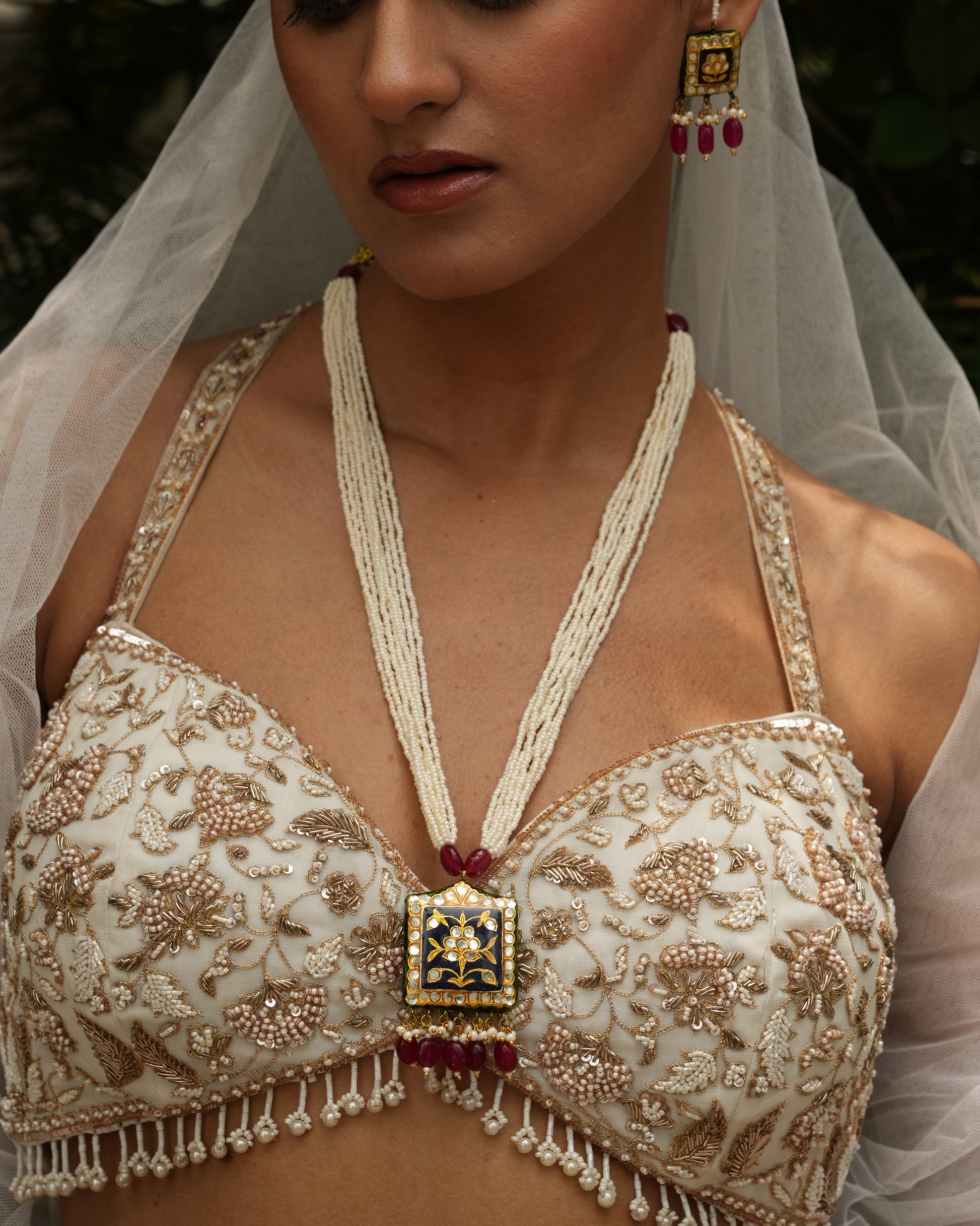 This square deep blue Meenakari pendant is a masterpiece of Rajasthani craftsmanship, adorned with shimmering Kundan stones, it reflects timeless elegance and artistry. The pendant is paired with a luxurious pearl mala, and complementing deep blue meenakari earrings with kaan chain. Its delicate detailing and radiant beauty make it a prized addition to any jewelry collection.
