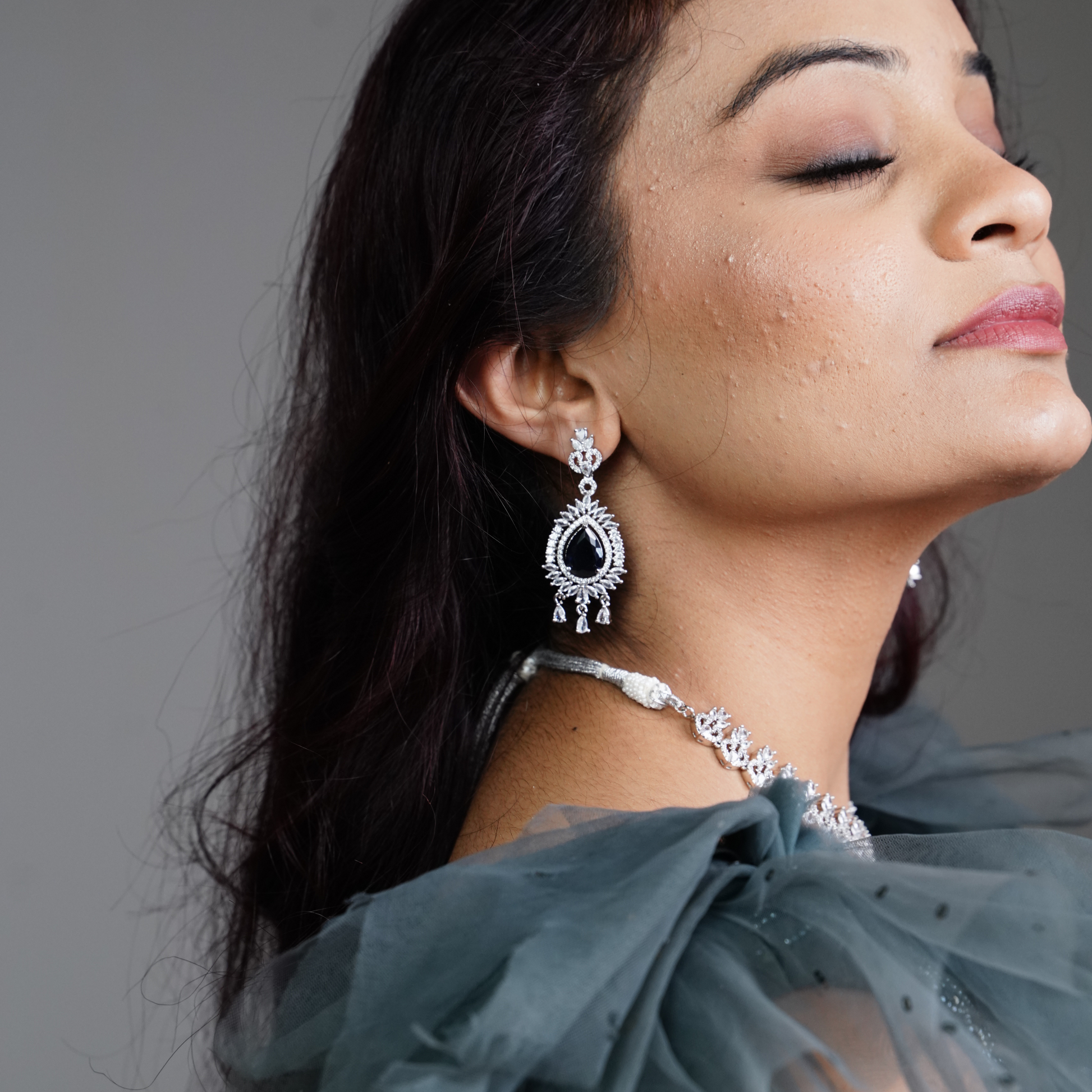 Elevate your look with Paakhi sapphire blue american diamond necklace set. Subtle yet sophisticated, adorned with Blue stones & shimmering American diamonds. Meticulously crafted, this ensemble features a breathtaking necklace accompanied by matching earrings all nestled in premium sterling silver.