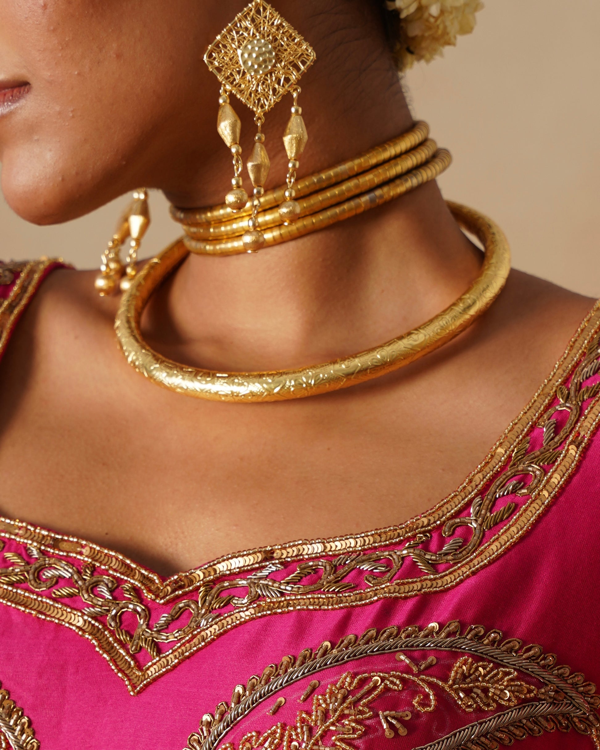 Phillaur gold handcrafted floral brass hasli, a playful yet timeless statement piece with handcrafted floral design. You can wear it with your ethnic attire or can also style with western wear. Hasli is a traditional wear in Rajasthan state of India. Crafted in pure brass with 18kt gold plating.