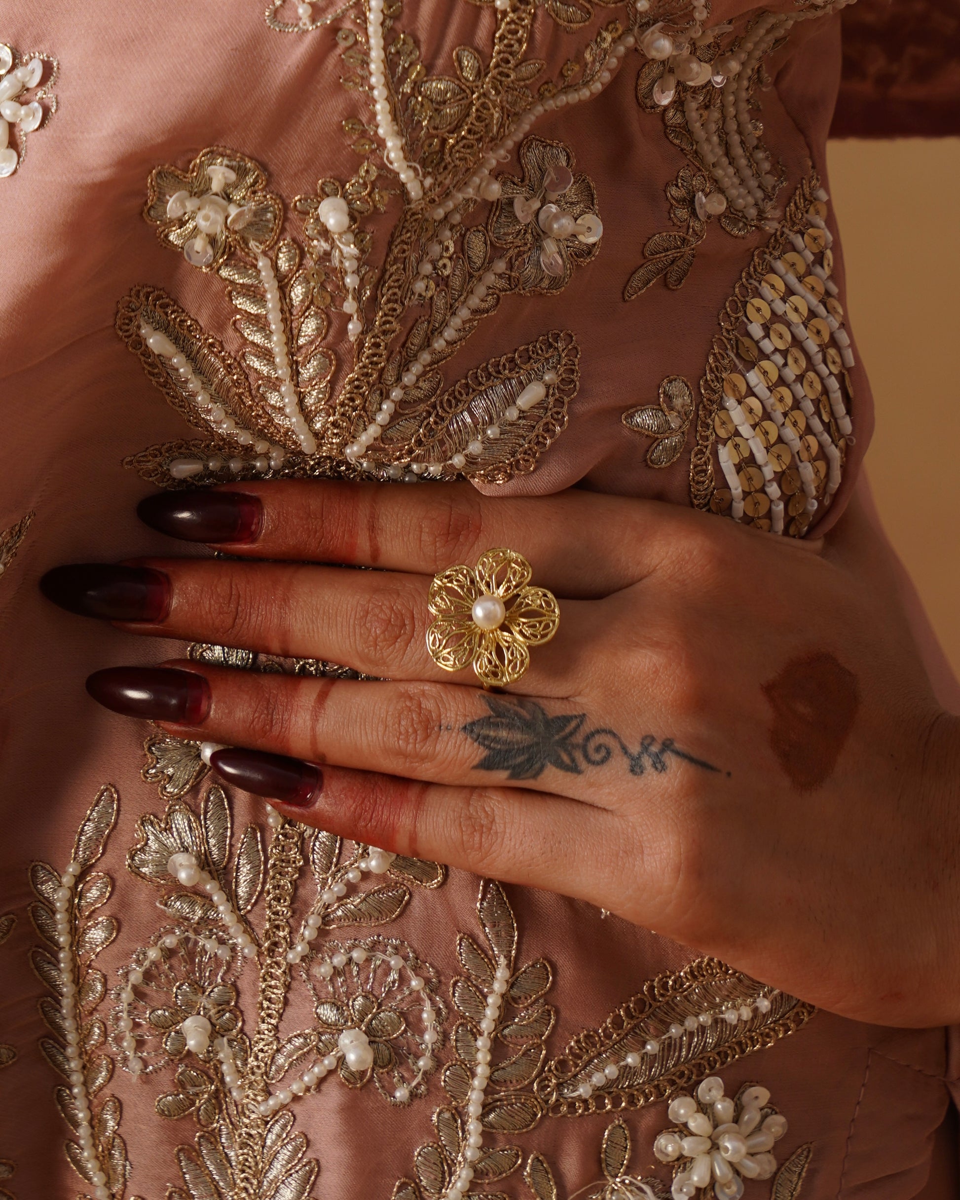 Delicate yet vibrant, the Phoolwari finger ring draws inspiration from blooming Indian flower gardens. Handcrafted by skilled artisans, its intricate floral design reflects the beauty of nature in full bloom. Each curve and petal is carefully detailed, symbolizing grace, growth, and feminine charm, this ring adds a refreshing burst of floral artistry to your everyday look—like wearing a little garden on your hand.
