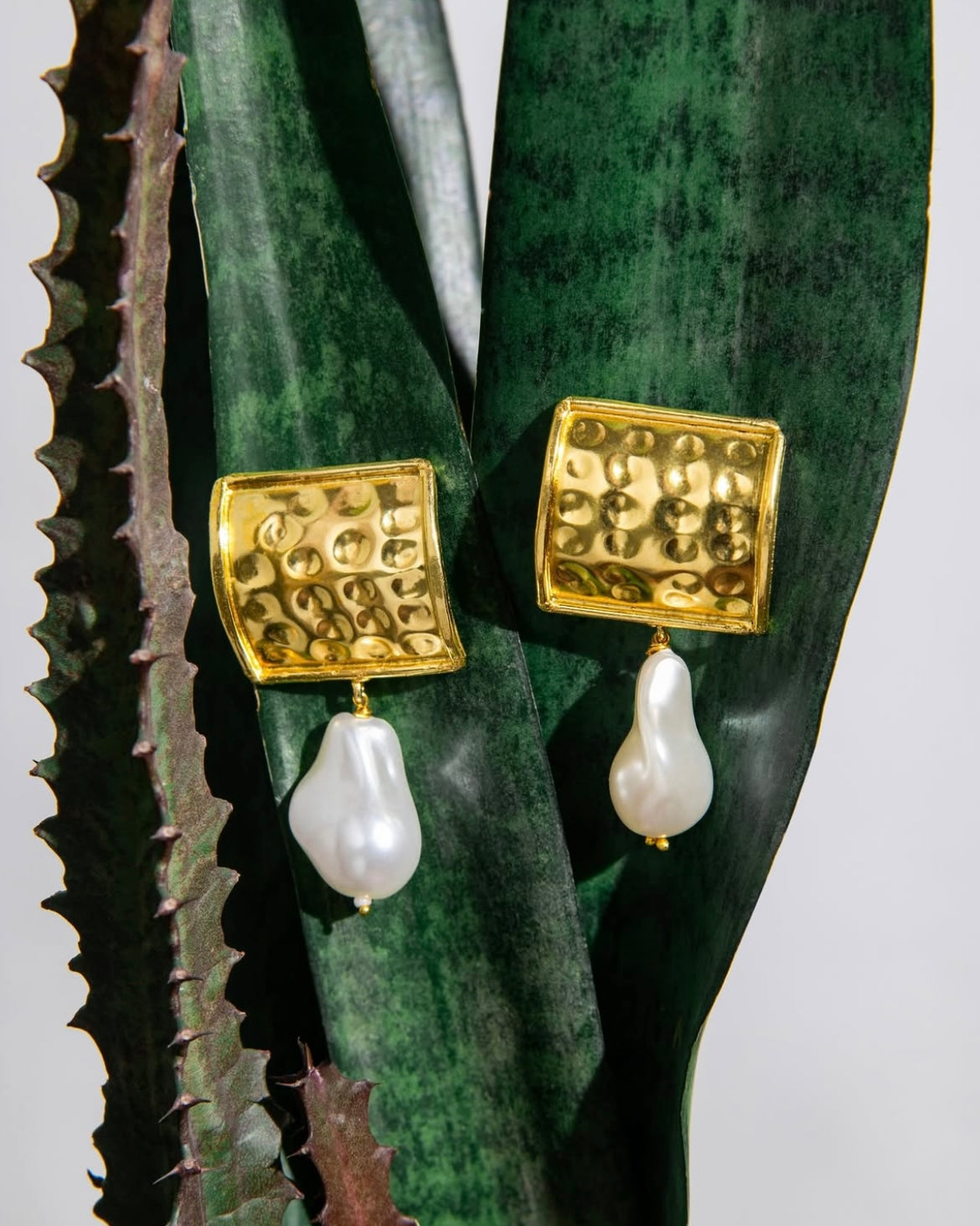 These stunning Hammered Quad-Shaped Hanging Earrings blend artisanal craftsmanship with timeless sophistication. Meticulously handcrafted, the hammered texture adds depth and character, giving each piece a unique, rustic charm. The geometric quad shape symbolises balance and harmony, while the elegant pearl drop enhances the design with a touch of grace and femininity.